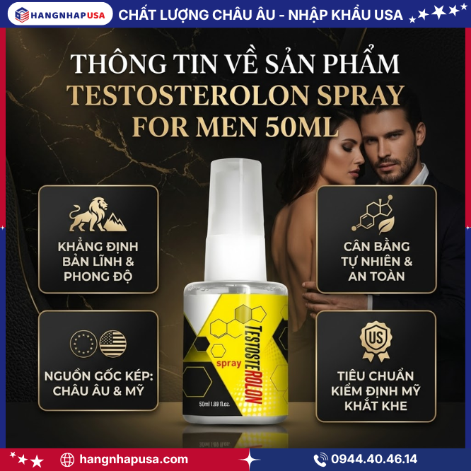 Testosterolon Spray For Men 50ml là dòng sản phẩm hỗ trợ sinh lực cao cấp được sản xuất tại EU và nhập khẩu chính hãng trực tiếp từ Mỹ. Với tiêu chuẩn kiểm định khắt khe từ Hoa Kỳ, sản phẩm tập trung vào việc hỗ trợ cân bằng nội tiết tố nam tự nhiên một cách an toàn và bền vững.