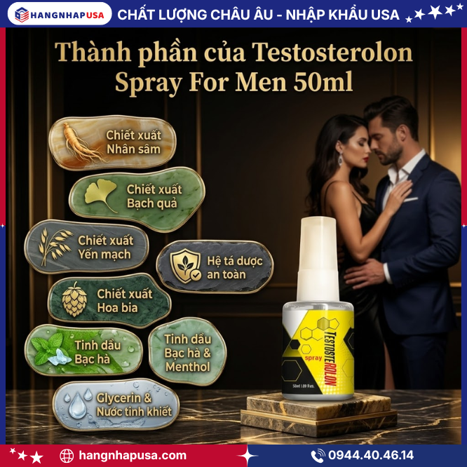 Hiệu quả bền vững của Testosterolon Spray For Men 50ml được khẳng định qua tiêu chuẩn chất lượng nghiêm ngặt từ Mỹ. Sản phẩm tác động sâu giúp hỗ trợ cân bằng nội tiết tố tự nhiên, từ đó đẩy lùi hiệu quả các dấu hiệu mãn dục nam và duy trì phong độ đỉnh cao cho phái mạnh.